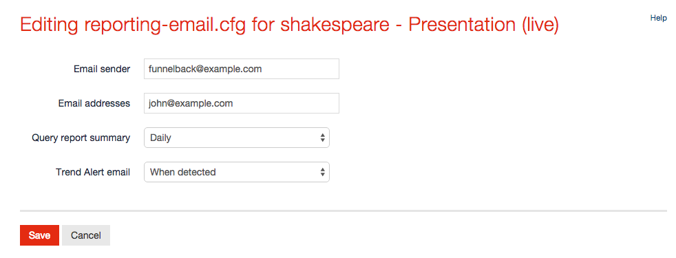 - Email sender: Configures the email address used as the from address for analytics emails. Must contain a single valid email address.