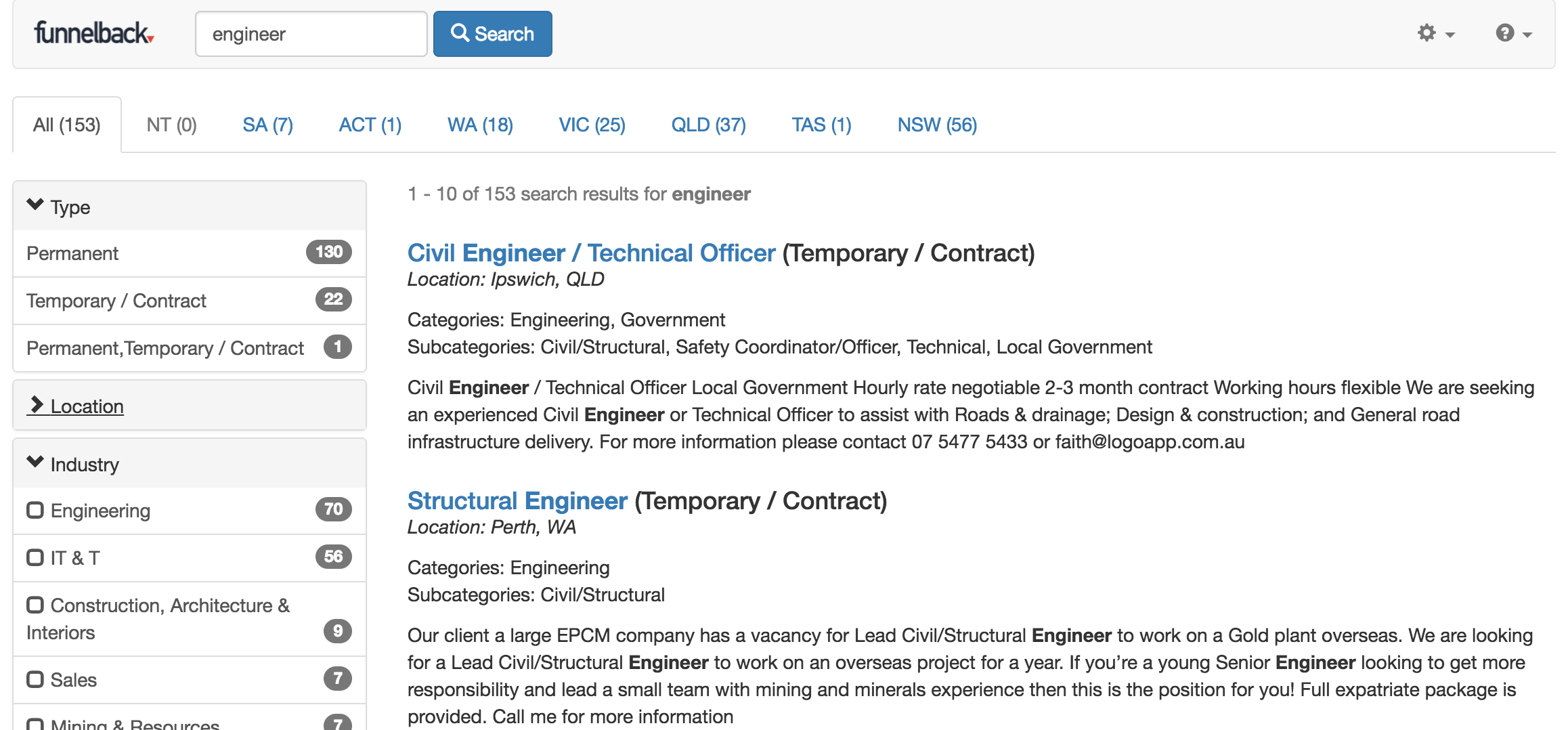 Selecting the engineering category value from the industry facet results in the search results being filtered to only include jobs categorised as engineering. This is the same behaviour as for a filter on single category facet.